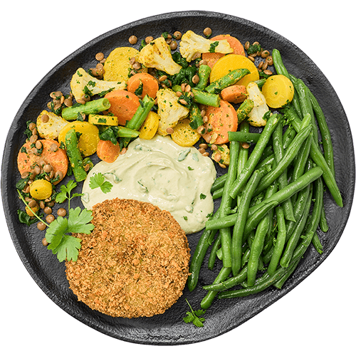 Steak végétarien aux pois maraîchers servis avec le mélange cuisiné à l’indienne et une sauce veggie au fromage frais et guacamole