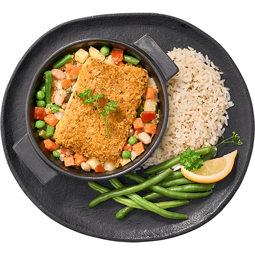 Portion de colin agrémenté d’un topping echalotes, chapelure crumble, vin blanc et herbes, servis sur un lit de légumes minestrone