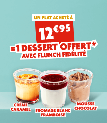 *Offre valable du 3 au 30 novembre pour l’achat d’un plat à 12,95€, hors plats “soirées à volonté”. Un dessert offert au choix : mousse au chocolat, crème caramel, ou fromage blanc framboises. Offre valable sur présentation d’une carte fidélité Flunch active ou pour toute souscription au programme de fidélité. Valable dans les restaurants participants et dans la limite des stocks disponibles